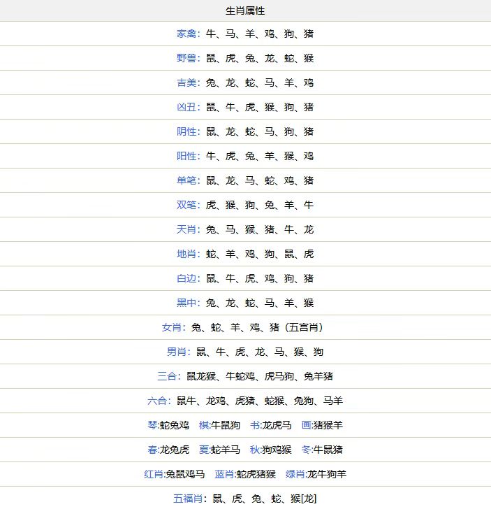 | 单肖:鼠虎龙马猴狗 双肖:牛兔蛇羊鸡猪 |